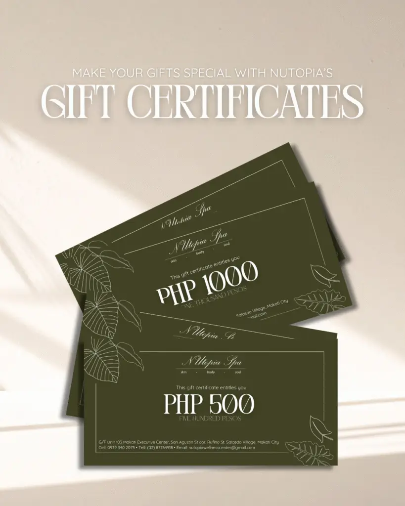 Nothing says “I care about your well-being” like giving someone the opportunity to slow down and unwind. Nutopia’s PHP 500 and PHP 1000 gift certificates are flexible, elegant, and perfect for any recipient.